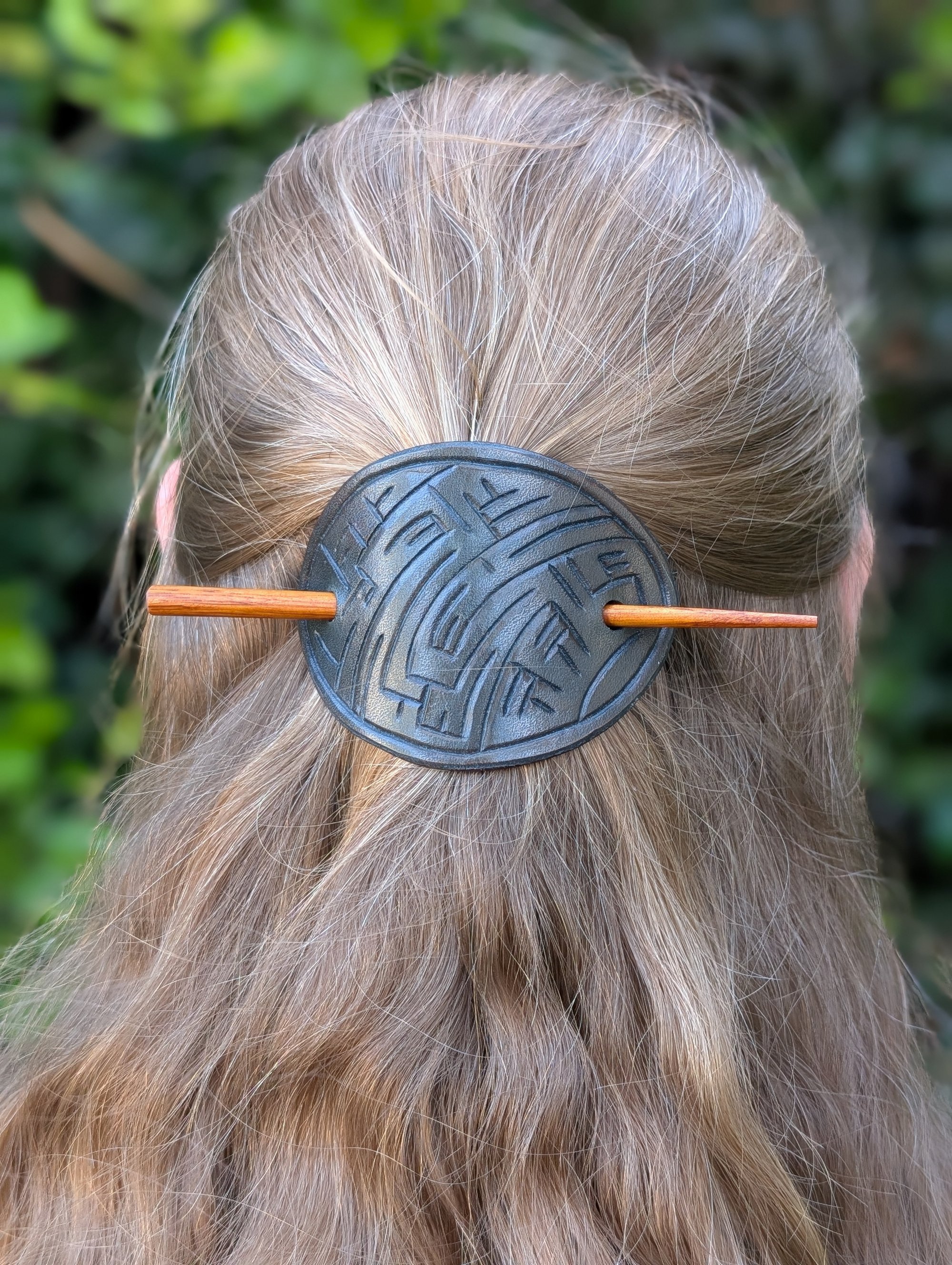 Hand-tooled leather hair barrette with wooden stick, dyed Dark Blue. (Approximately 4" x 2.5")
