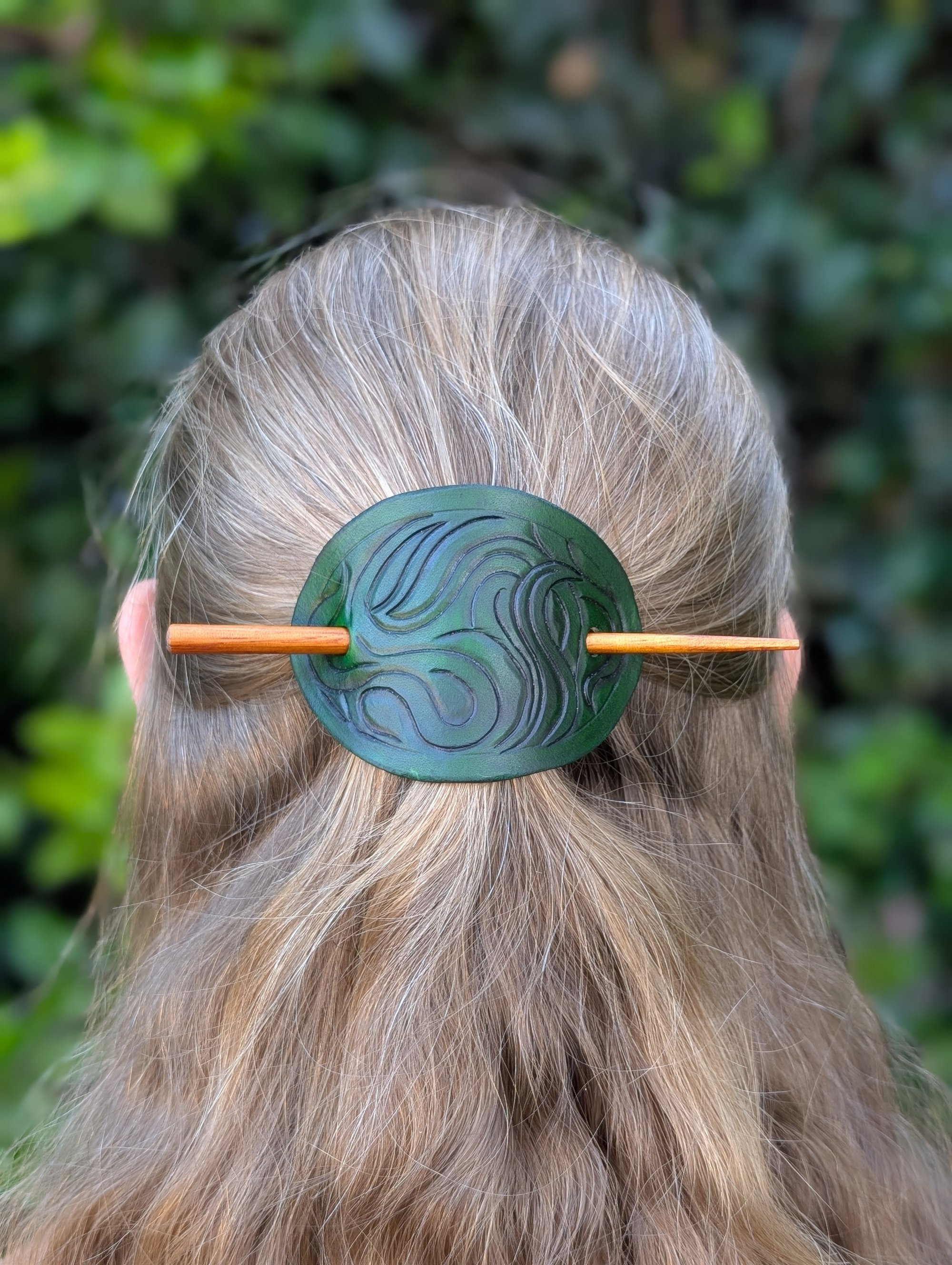 Hand-tooled leather hair barrette with wooden stick, dyed Forest Green. (Approximately 4" x 2.5")