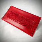 Hand-tooled/ hand-stitched flap pouch (8" x 4"), hand-dyed in Scarlet Red. 6-8oz Veg-Tan leather.